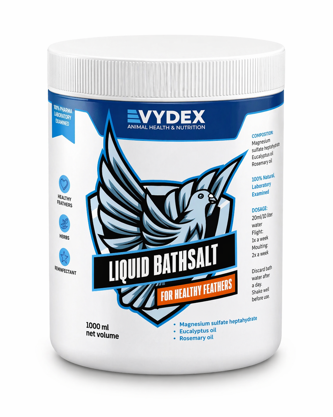 VYDEX LIQUID BATHSALT – Sare de baie lichidă este o soluție profesională pentru igiena porumbeilor, concepută pentru a menține penajul într-o stare optimă și pentru a susține sănătatea generală a păsărilor. Acest produs este esențial în rutina de îngrijire a porumbeilor de concurs, reproducție sau agrement.